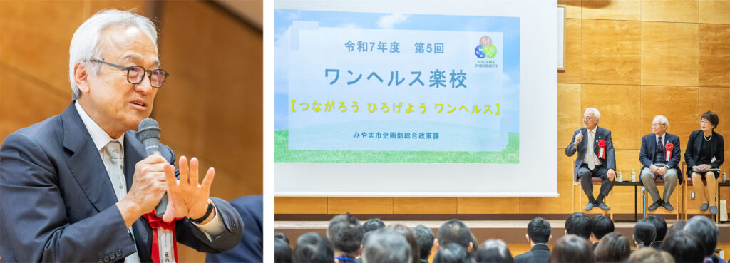 横倉先生は子どもたちの「自発性」と「発信力」に深く感銘を受け、未来を担う力を強調しました。藏内会長も、学年を超えて協力する子どもたちの「自主性」と「協働の姿勢」を高く評価し、みやま市が育んできた“絆”の広がりを称えました。さらに、ワンヘルスセンターが将来、世界中の研究者が訪れる“聖地”へと発展することへの期待を述べ、パネルディスカッションは温かい雰囲気の中で締めくくりました。